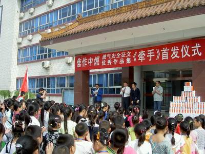 儀式上,焦作中燃公司領(lǐng)導(dǎo)協(xié)同焦作日?qǐng)?bào)社副總編輯一道,為到場(chǎng)的200余名校園小記者頒發(fā)了《牽手》和《燃?xì)獍踩R(shí)手冊(cè)》,并與他們合影留念。